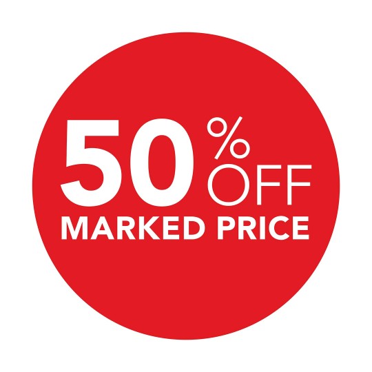 Make your customers take notice of your next sale with these removable pre-printed round labels. Carry around the convenient dispenser pack to quickly deliver labels wherever they are required. The box keeps the roll neat and labels protected for handy storage.These Red with White Text labels are pre-printed with ‘50% off Marked Price’ and are 24mm in diameter with 300 labels per pack
