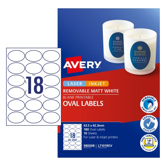 These white removable labels come in an oval shape of 63.5 x 42.3mm in size with 18 labels per sheet. With 10 sheets per pack, that’s 180 labels in total and can be printed using your laser or inkjet printer. They're great for gift items where pricing is removed before gift wrapping and especially for branding candles, glassware and jars.
