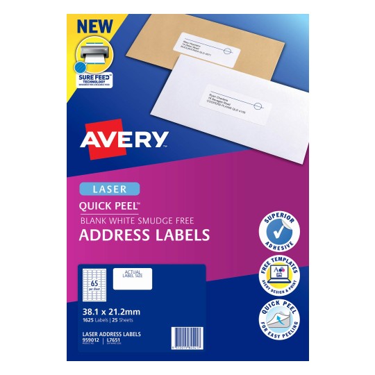 Make undelivered mail a thing of the past by adding your return address. Avery Laser Address Labels are designed to stay put on your envelopes. Whether you’re printing in black and white or adding colour, these bright white labels will look sharp and smart on your envelopes or small packages. Our mailing labels come with our special Quick Peel™ technology for faster application. Simply bend back the sheet and the label edge ‘pops-up’ making it quick to peel and apply to your envelopes. Only Avery address labels offer our Sure Feed feature that delivers a more reliable feed through your printer and prevents jams and misalignments.