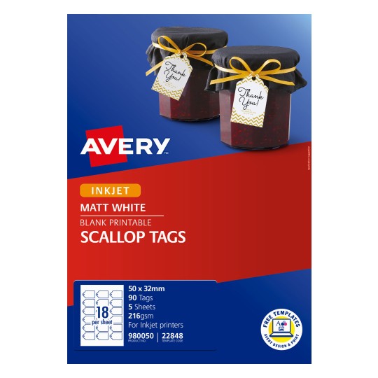 Create your own product tags to increase your brand image and communicate as much product and pricing information as you need with Avery Scalloped Printable Tags.These tags are designed with a unique scalloped shape to add a touch of class to your products and are ideal for conveying a premium look and feel. The high-quality card prints on both sides with vivid colours and sharp text using your laser or inkjet printer and comes with a pre-punched hole with premium fabric ties for secure and easy attachment to your products.