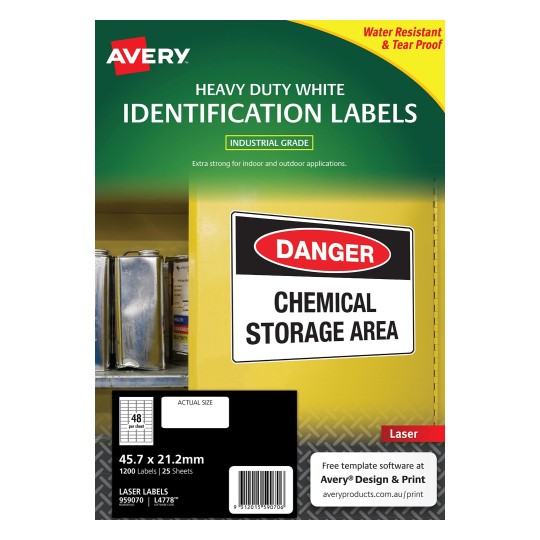 Avery Heavy Duty Identification Labels are engineered to take on tough industrial applications where a standard paper label is not fit for purpose. These durable labels are ideal for asset identification on machinery and equipment and organisation for storage and creating safety signs with our free and easy-to-use template software; Avery Design and Print - available at averyproducts.com.au/print